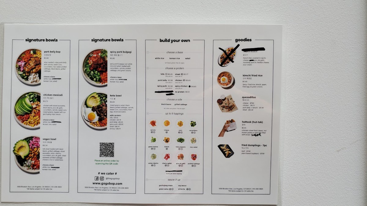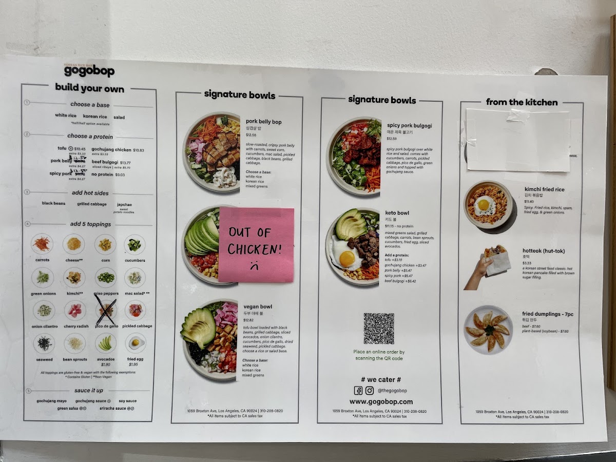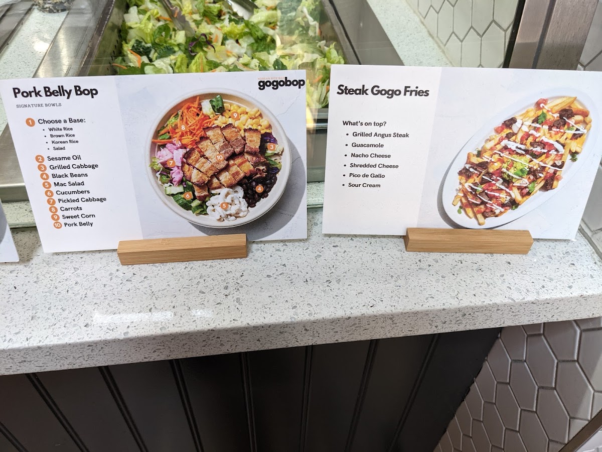 Overall, the menu at Gogobop Korean Rice Bar offers a simple yet satisfying range of customizable and ready-made options that cater to different tastes. The “Build Your Own Bowl” section stands out with choices like the Tofu Bowl, Half & Half Protein Bowl, Gochujang Chicken Bowl, No Protein Bowl, and Spicy Pork Bowl, allowing diners to tailor their meals with ease. For sides, the Beef Fried Dumplings (7pc) and Plant-Based Fried Dumplings (7pc) provide flavorful bites, while the sweet Hotteok adds a pleasant dessert option. Beverage selections such as Snapple Peach Tea, Poppi - Raspberry Rose, Snapple Raspberry Tea, Sprite (Can), and Poppi - Orange round out the experience with refreshing drinks. While prices are not listed, the menu’s concise structure and variety make it approachable, balancing classic Korean-inspired flavors with modern, customizable dining.